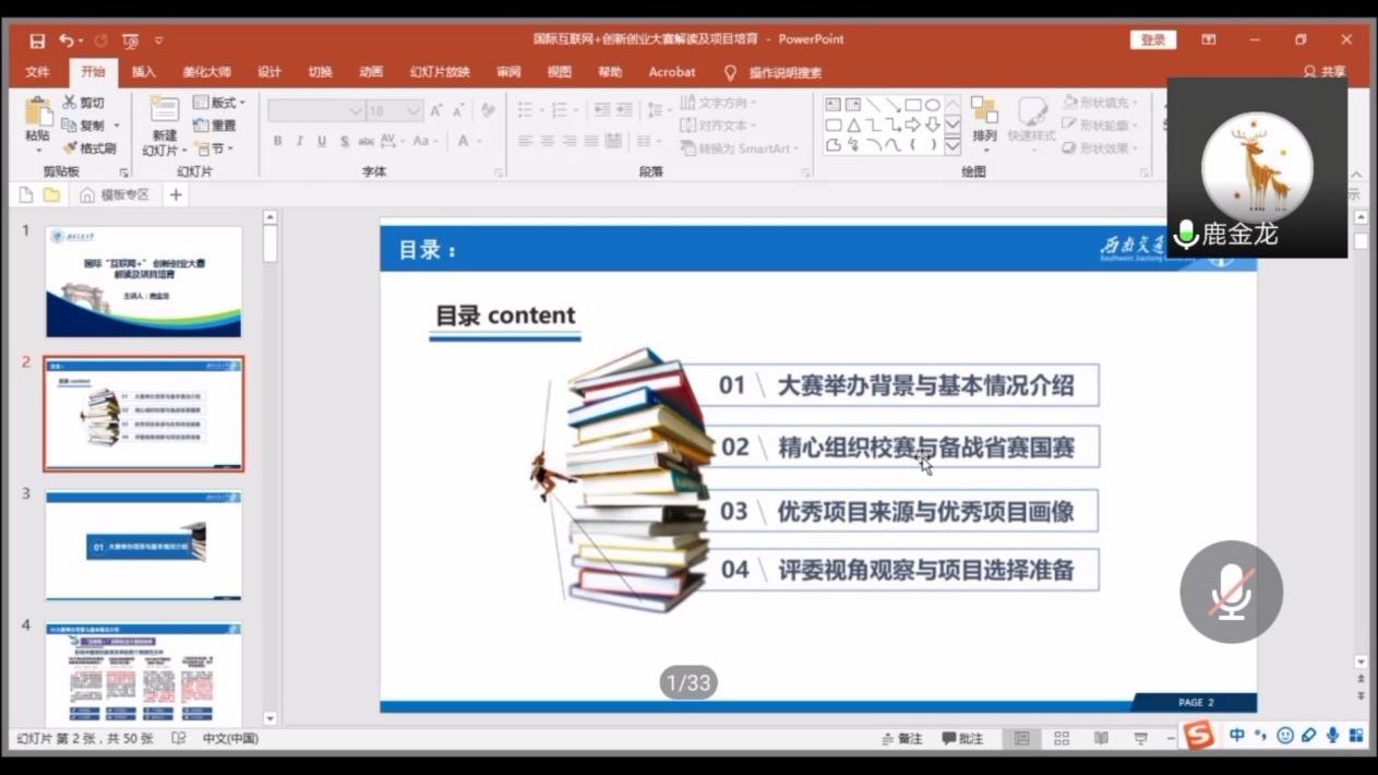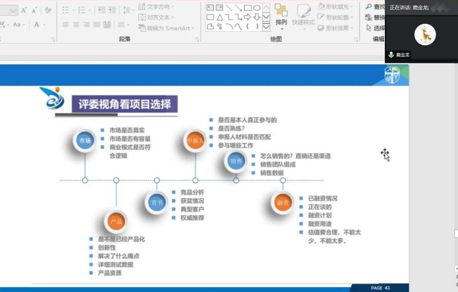 鹿老师从“大赛举办背景与基本情况介绍”、“精心组织校赛与备战省赛国赛”、“优秀项目来源与优秀项目画像”、“评委视角观察与项目选择准备”这四个方面对本次创新创业大赛进行了精心讲解。