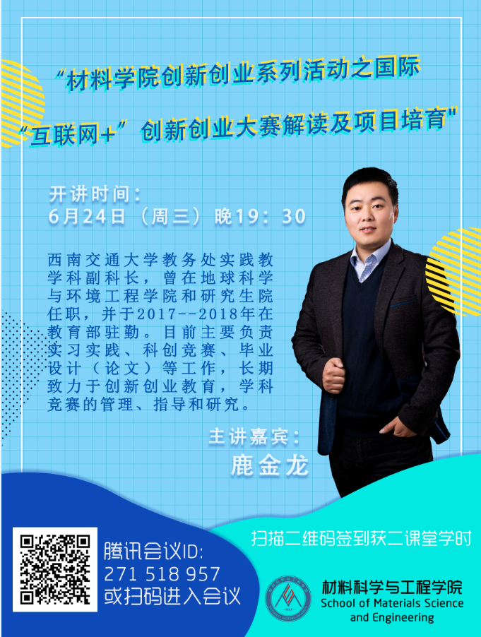 2020年6月24日19:30,团建中心面向全校师生,于线上成功举办了“材料学院创新创业系列活动之国际‘互联网+’创新创业大赛解读及项目培育”讲座,同时作为材料学院2021届毕业生就业指导系列活动之一,本次讲座特别邀请了taptap188官网入口教务处实践教学科副科长鹿金龙老师主讲。鹿老师目前主要负责实习实践、科创竞赛、毕业设计(论文)等工作,长期致力于创新创业教育,学科竞赛的管理、指导和研究。