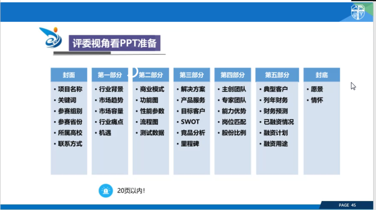 鹿老师讲解了今年大赛相对于往届大赛的新变化,同时着重对同学们关注点较高的“评委视角看项目选择”部分进行了讲解,从“市场”、“产品”、“背书”、“申报人”、“销售”、“融资”六个方面共24个点逐一分析,对大赛PPT的准备也分享了详细的制作要领,令同学们受益匪浅,照亮了同学们的参赛之路。