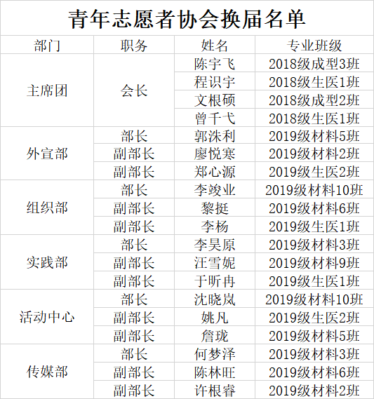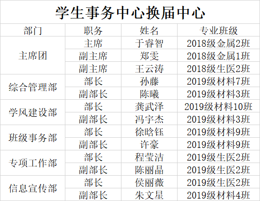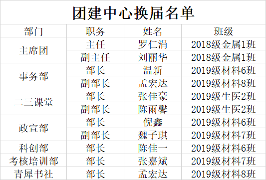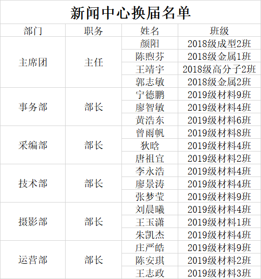 经过为期两周的员工自主申请、线上答辩、民主投票,现将材料学院团委部分员工组织(团建中心、青年志愿者协会、新闻中心、事务中心)换届结果公示如下: