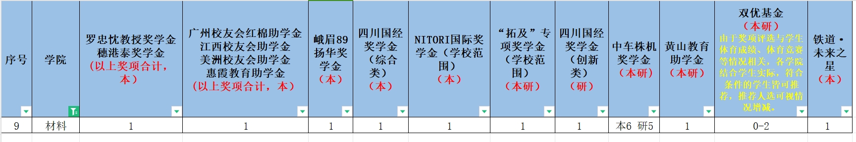 公司学校范围专项奖助学金可推荐名额分配表如下图所示;学校范围专项奖助学金评选办法见学校通知附件3。