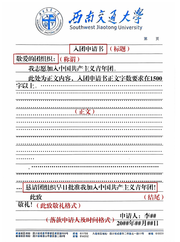 3.正文:在称呼下一行空两格写“我志愿加入中国共产主义青年团”。正文要从“我志愿加入中国共产主义青年团”下一行空两格处写起。