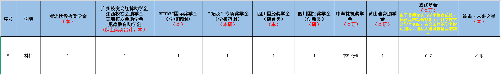公司学校范围专项奖助学金可推荐名额分配表如下图所示;学校范围专项奖助学金评选办法见学校通知附件4。
