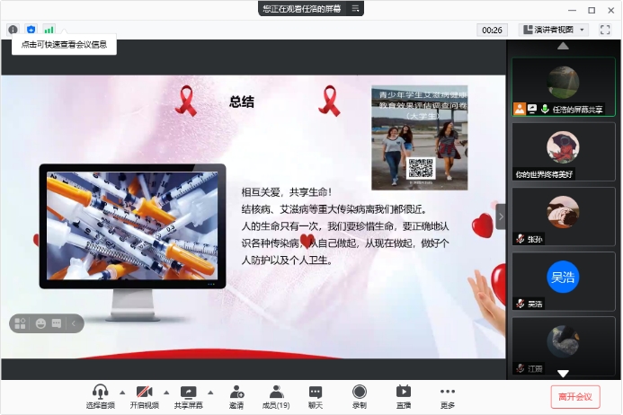 2021年3月23日20:00,taptap188官网入口2019级硕士5班全体同学于腾讯会议开展了以“防控疾病,关爱自我”为主题的云主题班会。本次班会由班长任浩主持,2019级硕士5班全体同学参与。班会主要向同学们科普了结核病以及艾滋病相关知识和预防措施 。