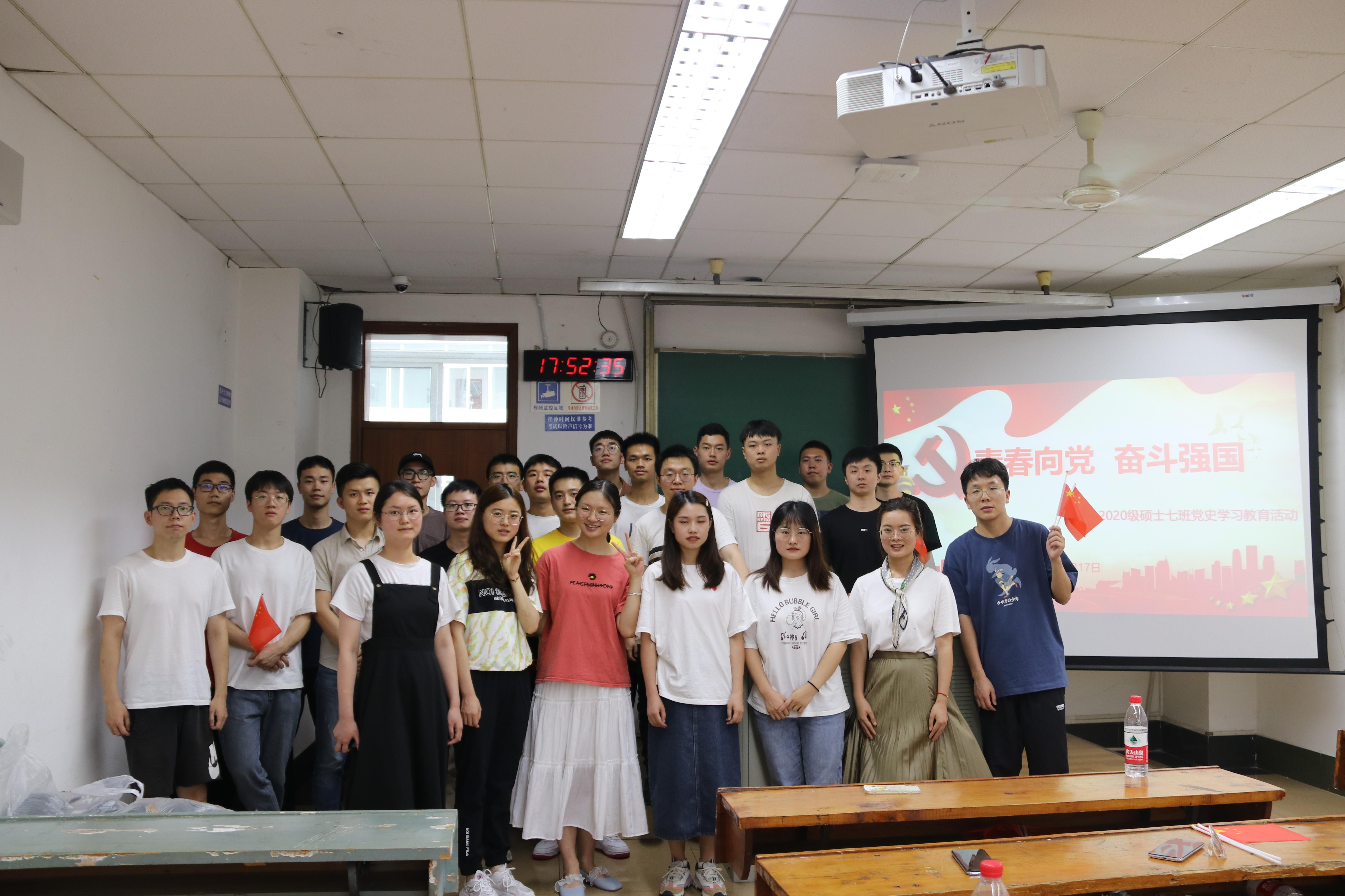 为进一步贯彻习近平总书记在党史学习教育动员大会上的讲话精神,做到学史明理、学史增信、学史崇德、学史力行,学党史、悟思想、办实事、开新局,以昂扬姿态迎接建党一百周年。2021年6月17日下午16时,材料学院2020级硕士7班,在九里校区4403B举办了“青春向党·奋斗强国”党史学习教育主题活动。本次活动由班长黄成、团支书李俊杰牵头策划,全体班委参与组织,全班同学积极参与。活动由李俊杰同学主持,2020级研究生辅导员王誉静老师参与本次活动。
