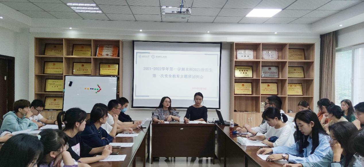 9月18日下午13:00,2021级辅导员许欢,董海霞主持召开新生第一次安全教育主题班团例会,2021级班长,团支书,生活委员全员参会。首先,许欢老师强调宿舍用电安全,违规电器使用等相关处理办法。随后,董海霞老师安排各班召开安全教育主题班会和宿舍安全检查,强调同学们注意节假日出行安全。