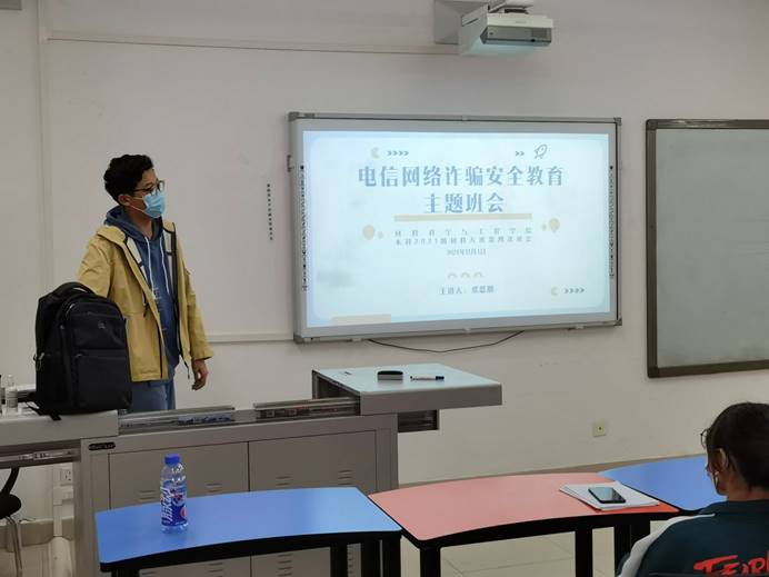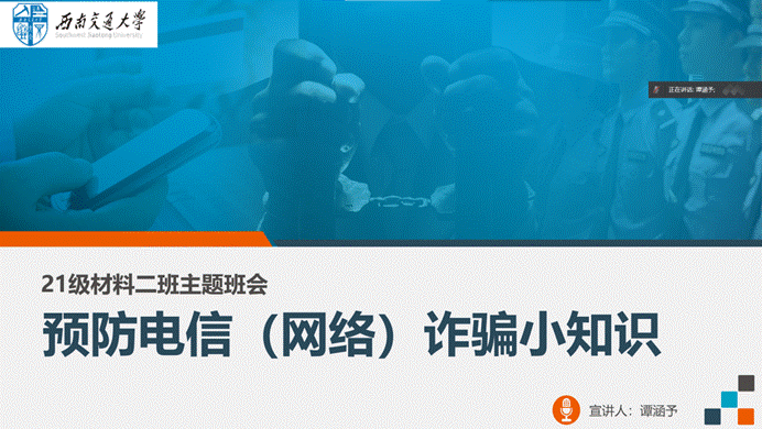 最后,材料学院本科2021级13个班级按要求召开《安全教育主题班会——预防电信诈骗》,传达班团例会会议内容,重点普及网络诈骗相关知识,以身边的真实案例,提醒同学们要时刻防范网络电信诈骗。