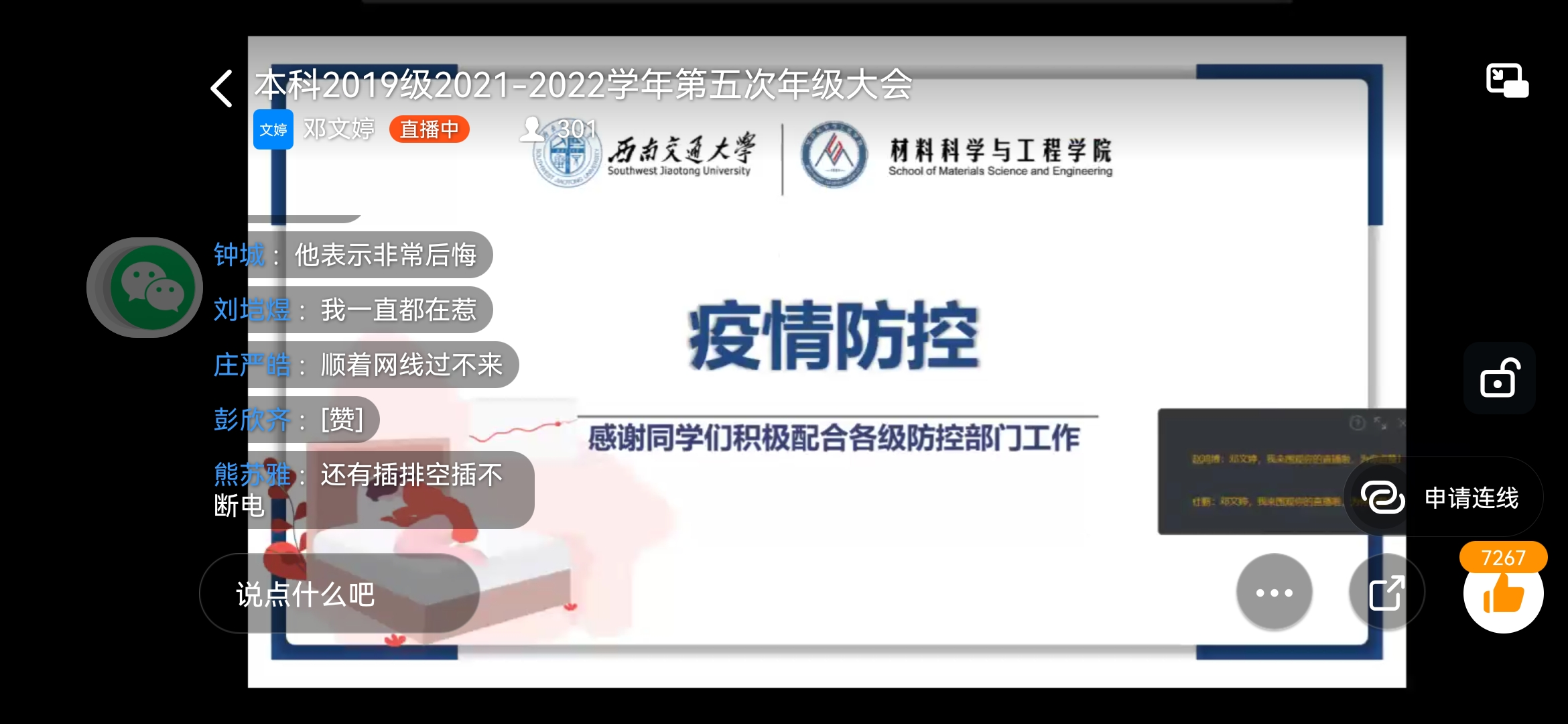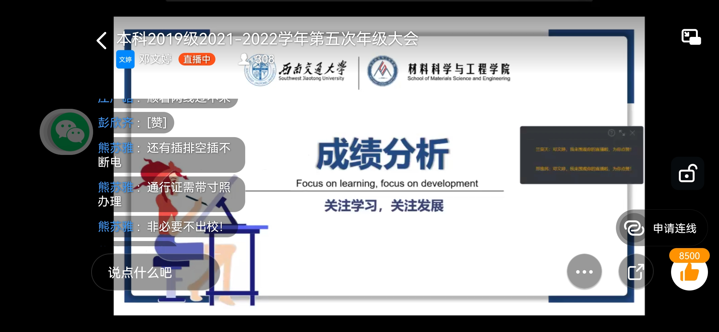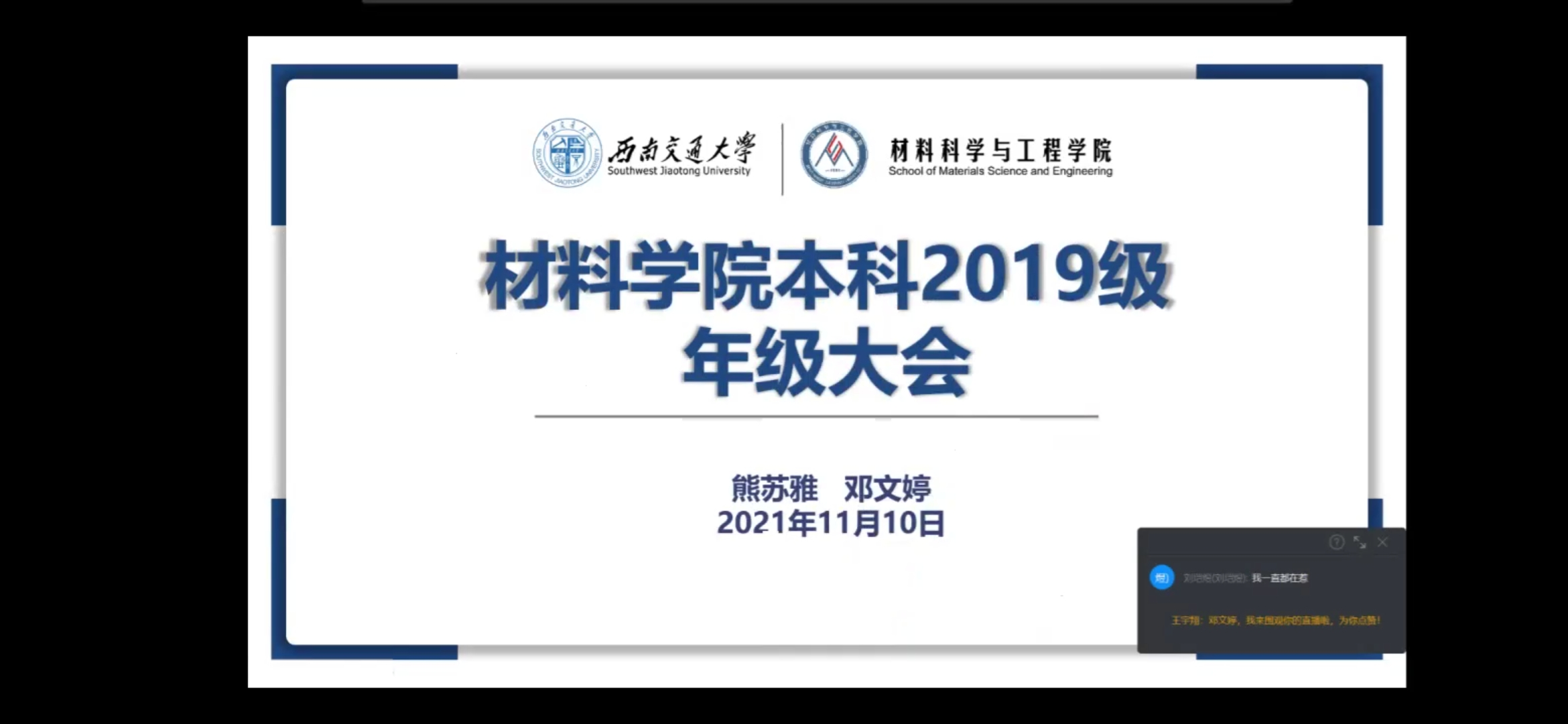 响应学校疫情防控的要求,材料学院本科2019级2021-2022学年第五次年级大会聚焦“安全”和“成绩”两个关键词,于2021年11月10日晚21:30在钉钉平台顺利召开。2019级本科全体同学参与大会,2019级辅导员邓文婷、熊苏雅出席并主持。