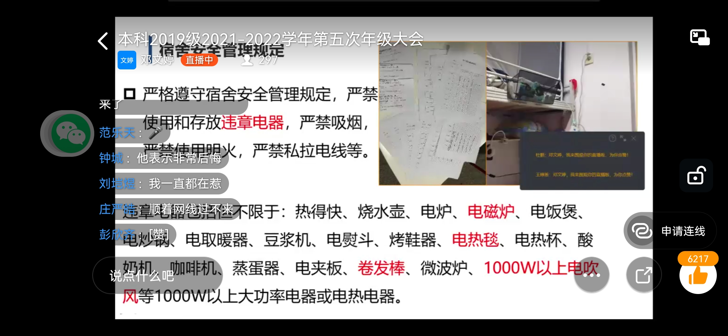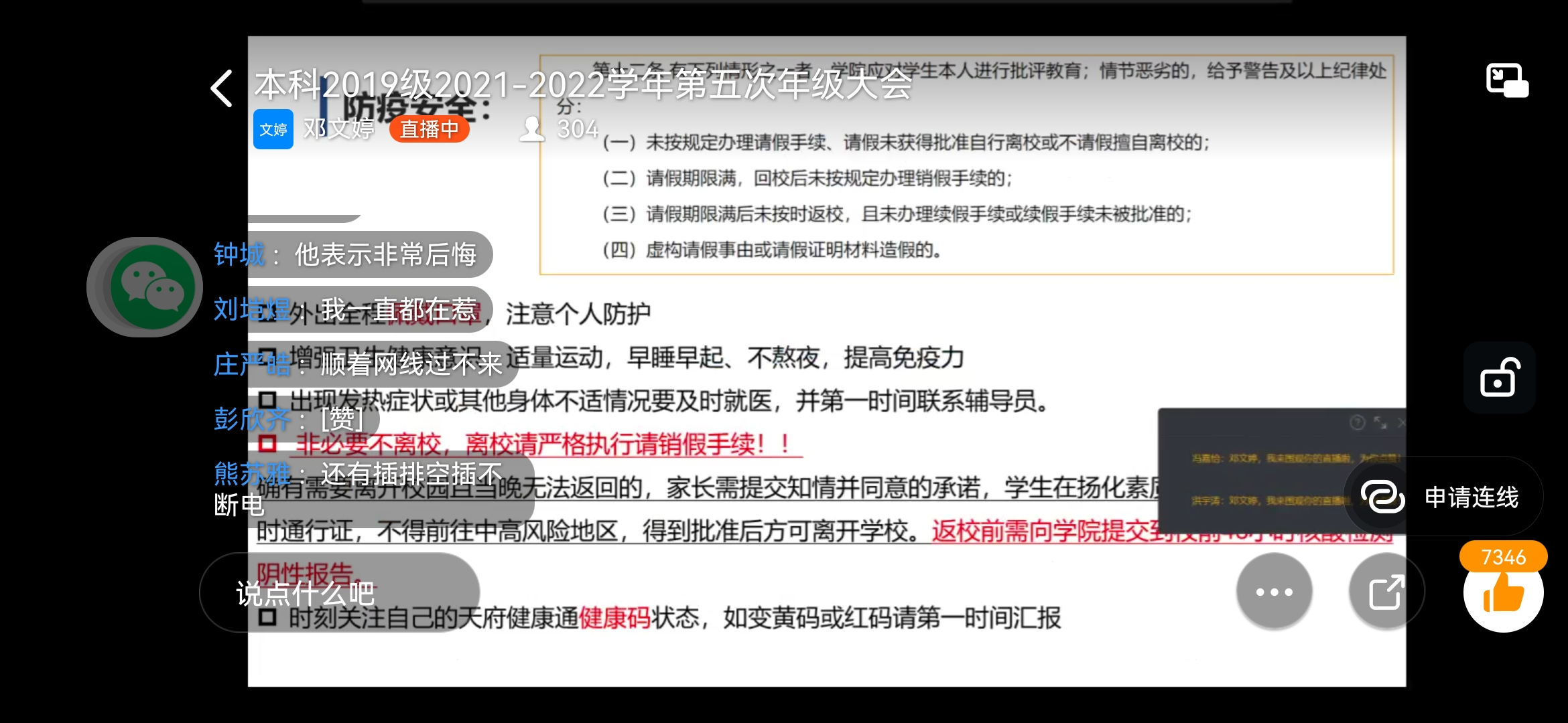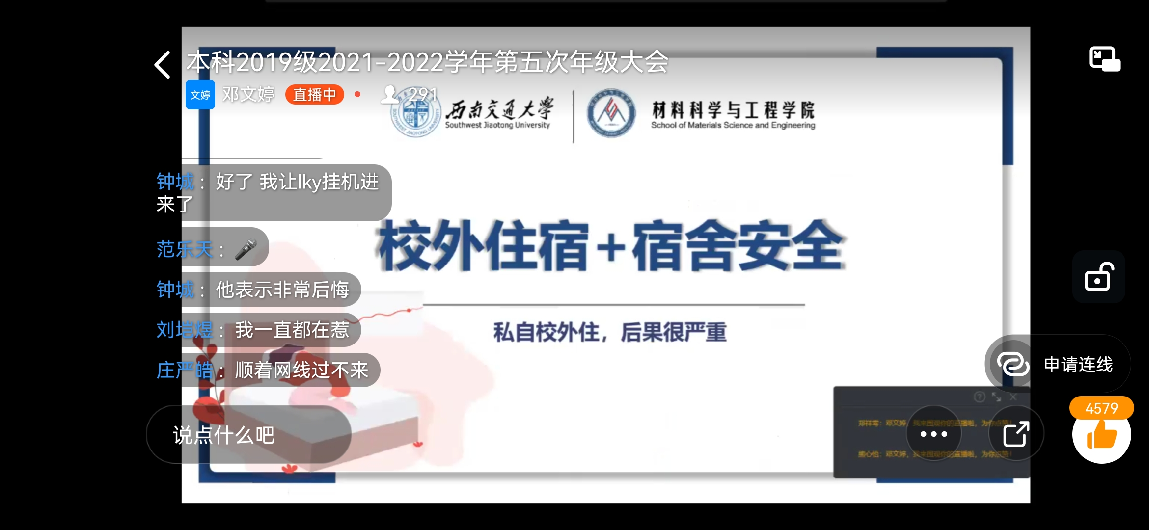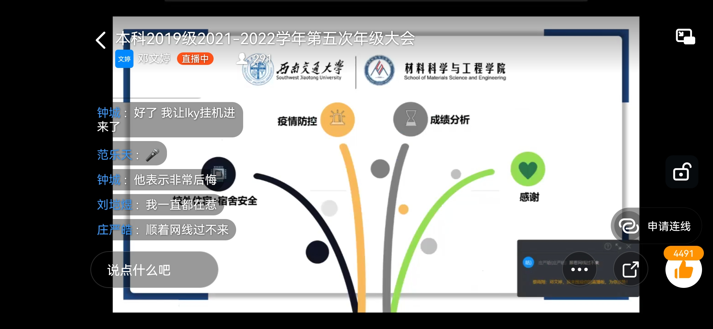 响应学校疫情防控的要求,材料学院本科2019级2021-2022学年第五次年级大会聚焦“安全”和“成绩”两个关键词,于2021年11月10日晚21:30在钉钉平台顺利召开。2019级本科全体同学参与大会,2019级辅导员邓文婷、熊苏雅出席并主持。