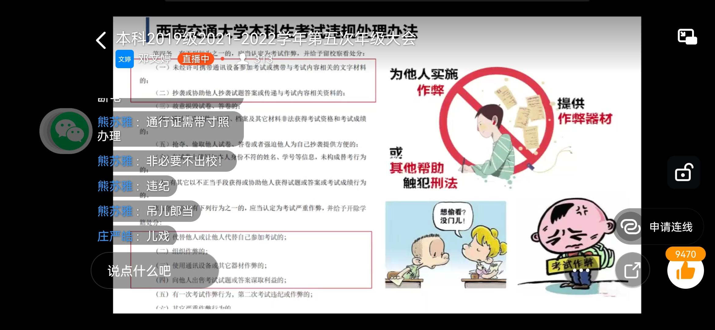 最后,熊苏雅再次强调疫情防控事宜,同时提醒同学们关注学校通知以及课程教师的安排,也不要因为“上网课”而懈怠。在邓文婷解答了一些同学们的疑问之后,本次大会圆满结束。