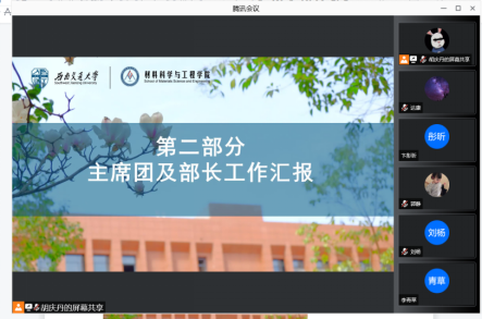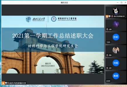 2021年12月9日下午14:30,taptap188官网入口研究生会通过腾讯会议在线上举行了述职大会。参加此次会议的有研究生会指导老师罗丹,材料学院院级评议会成员以及研究生会成员,会议由研究生会执行主席胡庆丹主持。