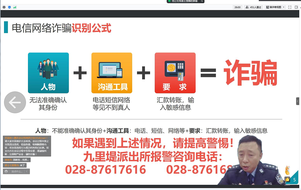 为加强研究生自我防护教育,确保校园平安、稳定、有序,进一步预防电信网络诈骗,普及反诈骗知识,材料学院积极开展2022“铸盾”研究生安全教育活动。2022年3月22日晚19:00,材料学院员工工作组邀请九里堤派出所赵磊警官为全体研究生开展了“筑堤九里,守护平安”防范电信网络诈骗专题教育。