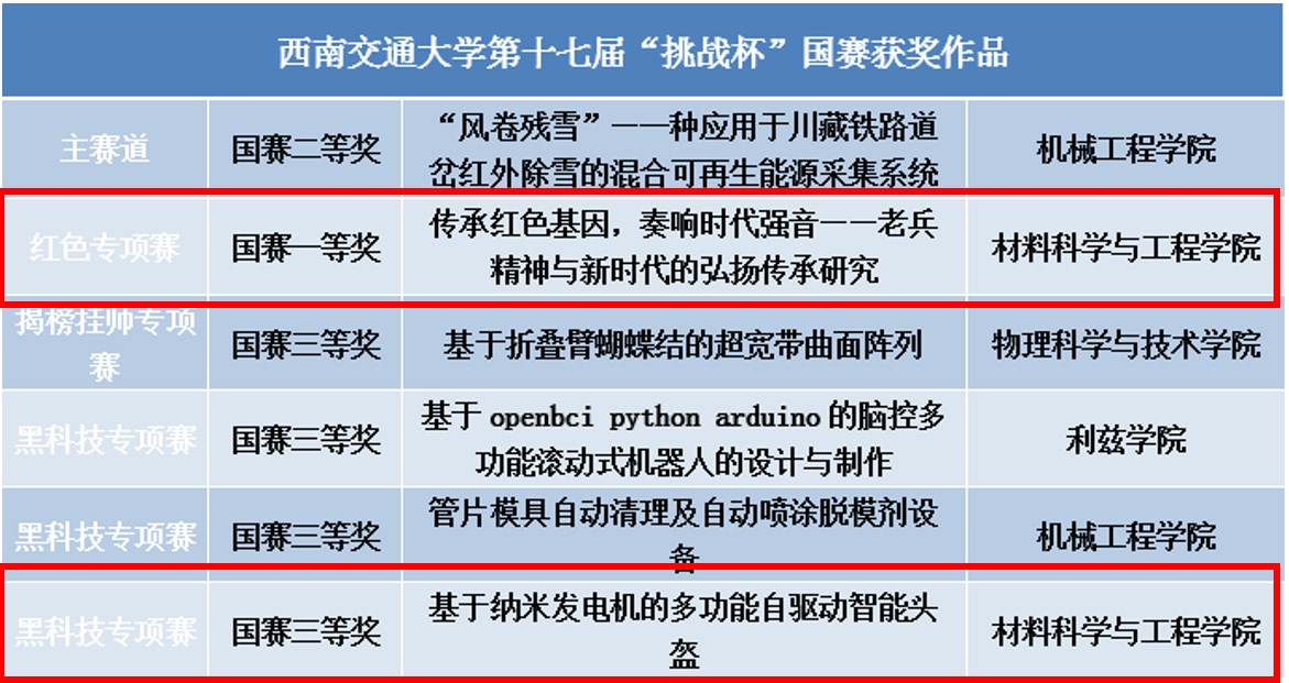 taptap188官网入口选送的《传承红色基因,奏响时代强音——老兵精神与新时代的弘扬传承研究》从全国10000余件作品激烈角逐中脱颖而出荣获红色专项赛全国一等奖,《基于纳米发电机的多功能自驱动智能头盔》荣获黑科技专项赛全国三等奖,取得材料学院在该项赛事中的最好成绩。