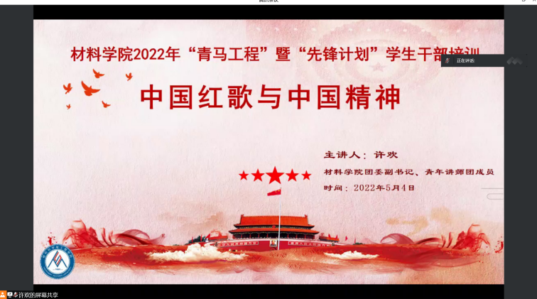 2022年5月4日15:30,材料学院2022年度“青马工程”暨“先锋计划”员工干部培训第二专题——“中国红歌与中国精神”顺利举行。本次培训由材料学院团委副书记、青年讲师团成员许欢主讲,参与培训的有学院本科各年级和员工组织员工骨干,以及2022年度新发展团员。