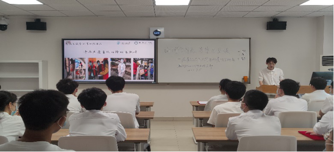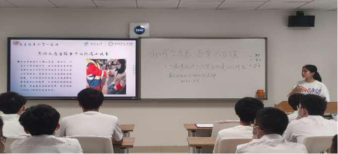 班会第三个环节——“承时代之风 诉青年之志”。老员工不仅要做遵守防疫要求的表率,更要争做参与防疫志愿服务的排头兵。班上的陈诗怡和易玥同学曾在地方参与疫情防控志愿服务工作,他们为大家动情讲述了自己参与防疫志愿服务工作期间的点滴见闻和心得体会。同学们在倾听中领会到疫情防控工作的不易,更感受到担当和奉献的青春荣光。