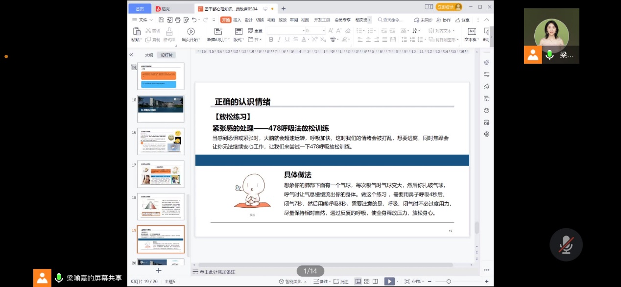 学习心理知识,提升心理素质。材料学院青年讲师团成员梁喻嘉为参训学员主讲“团学干部心理知识普及心理健康教育”,从青年员工普遍面临的心理问题入手,结合典型案例分析,深入浅出地向同学们普及心理知识,旨在帮助他们提升应对挫折、调整心态的能力,以更加乐观的心态面对未来的学习、工作和生活。针对当前老员工群体心理问题越发突出的情况,梁喻嘉老师专门为学员们传授了如何发现和应对心理危机、如何帮助面临心理问题困扰员工的经验和方法。
