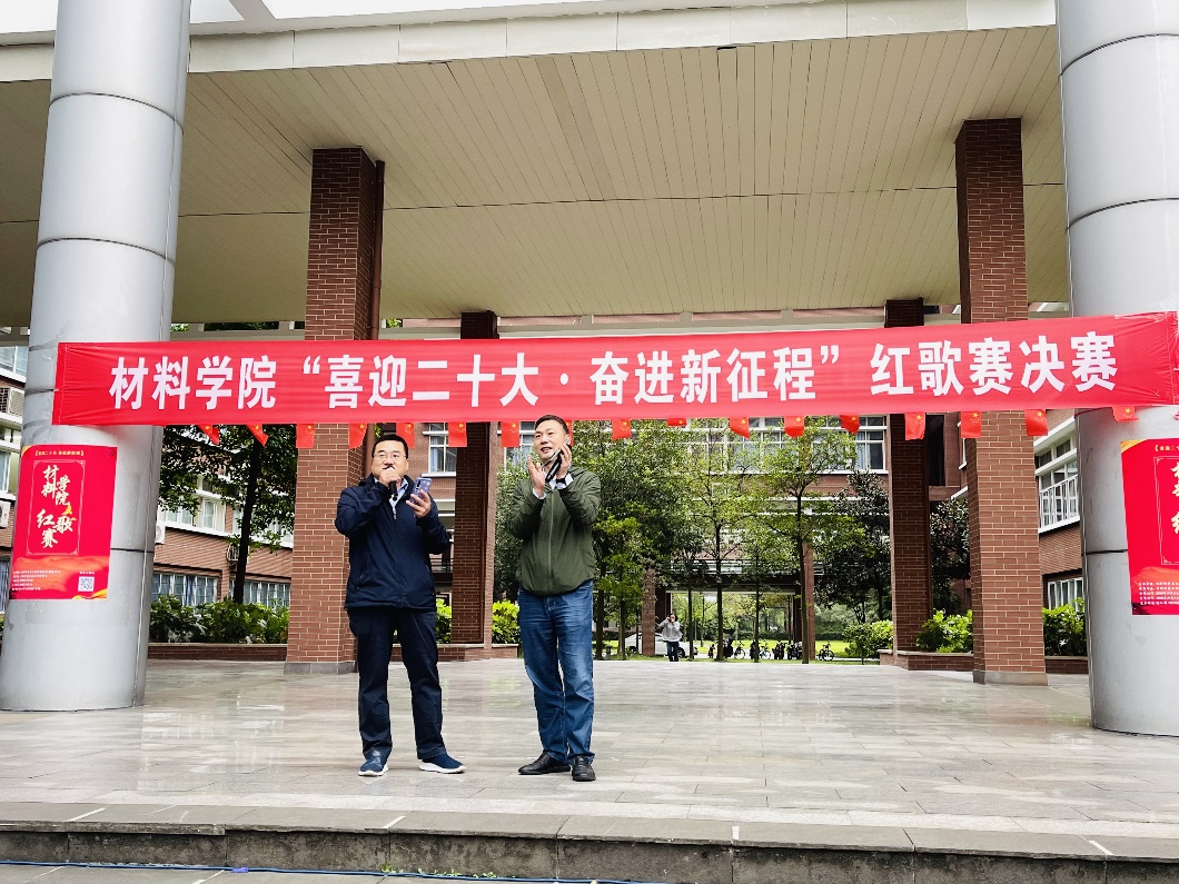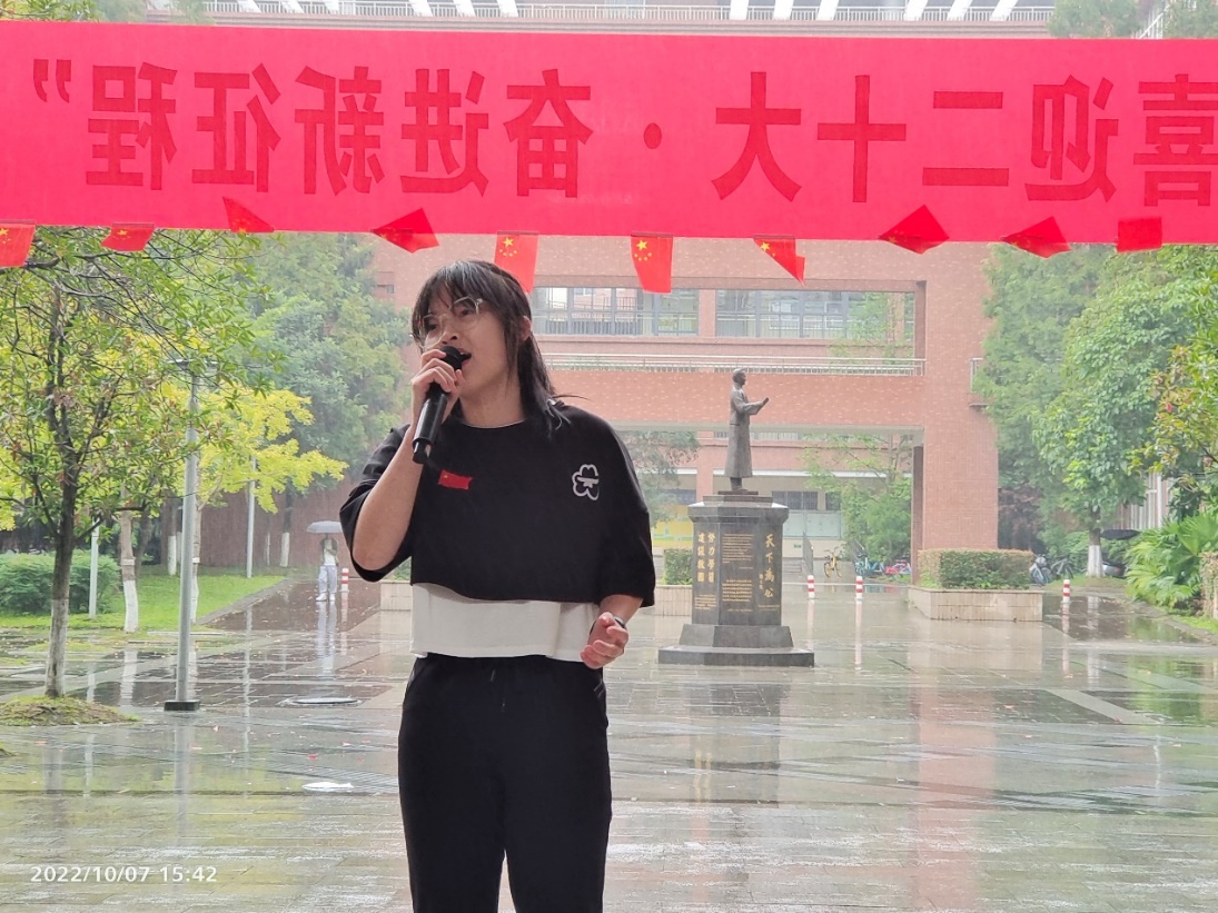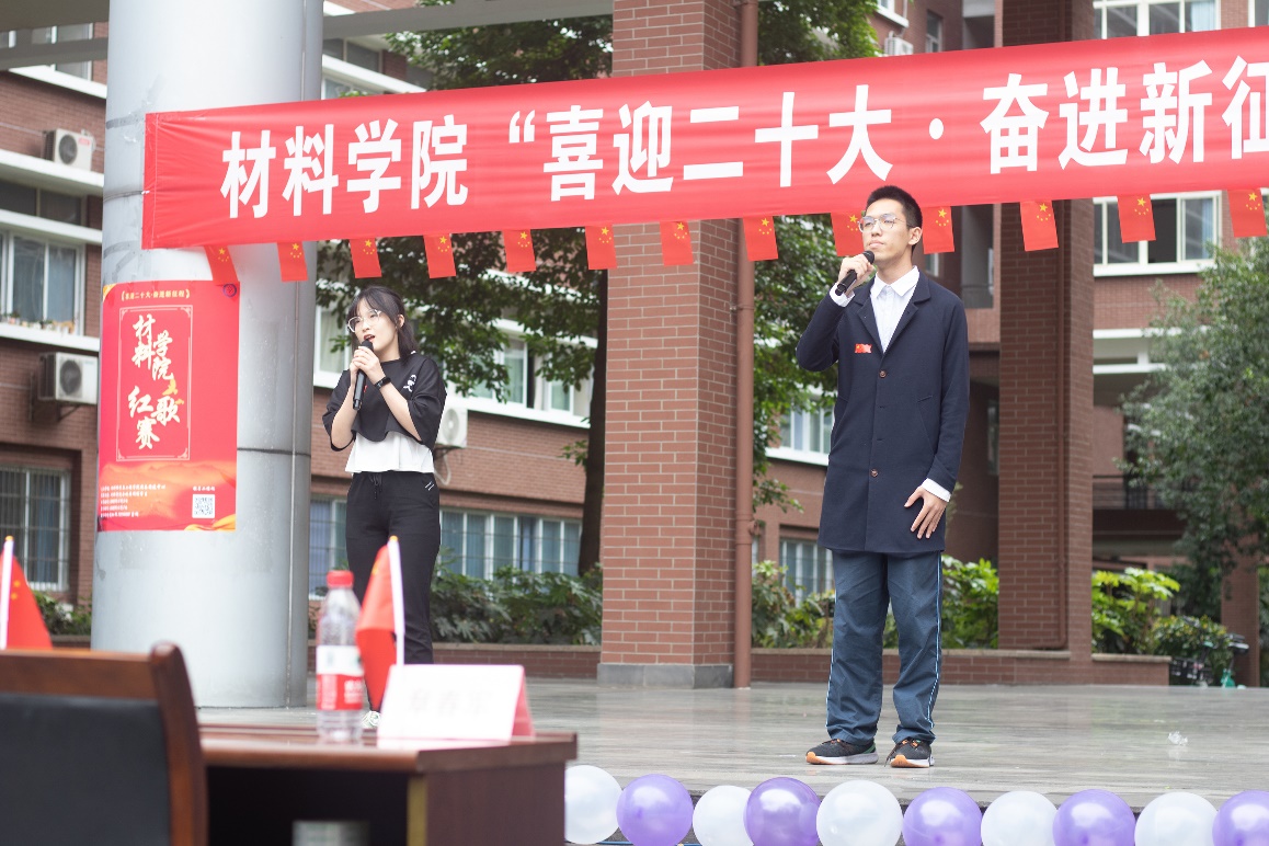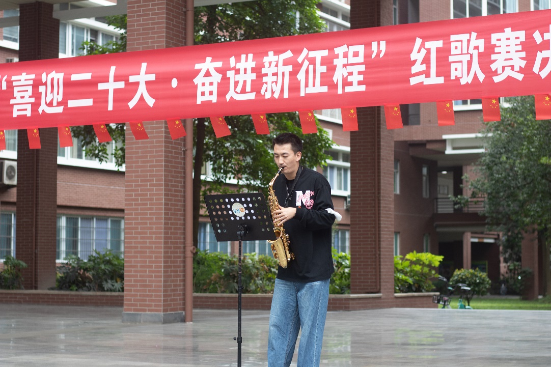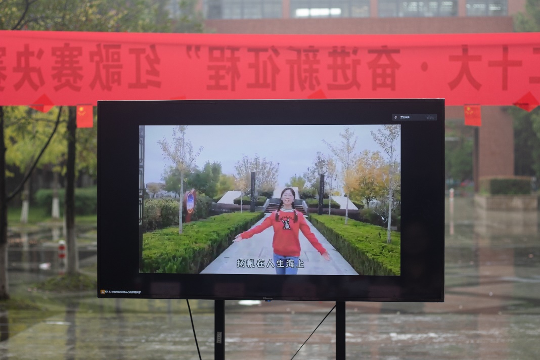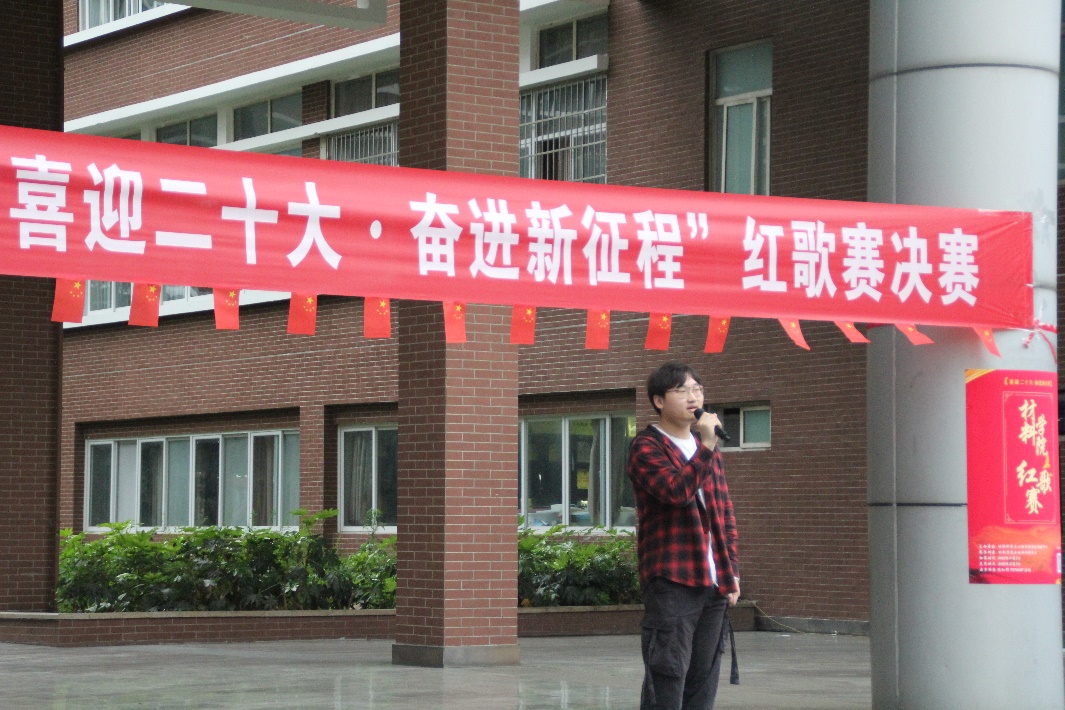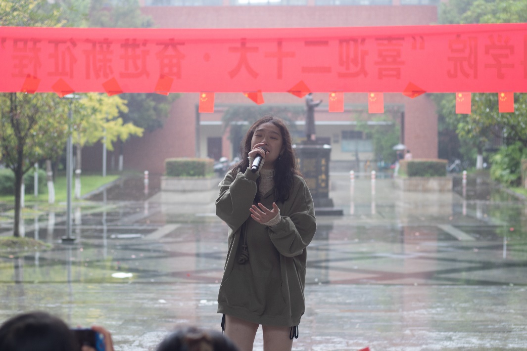 金秋时节,细雨霏霏,天空中突然飘起的雨花并未击退同学们的热情,场地迅速转换,参赛者们仍以或激昂高亢、或字句铿锵、或低沉颂吟的红歌,真情歌颂党的丰功伟绩,抒发对党的炽热情怀,唱出了“喜迎二十大•奋进新征程”的坚定信念与对党丰功伟绩的不朽赞歌。