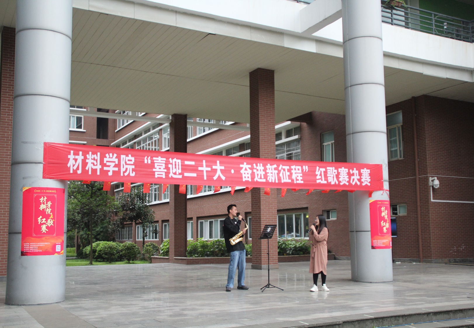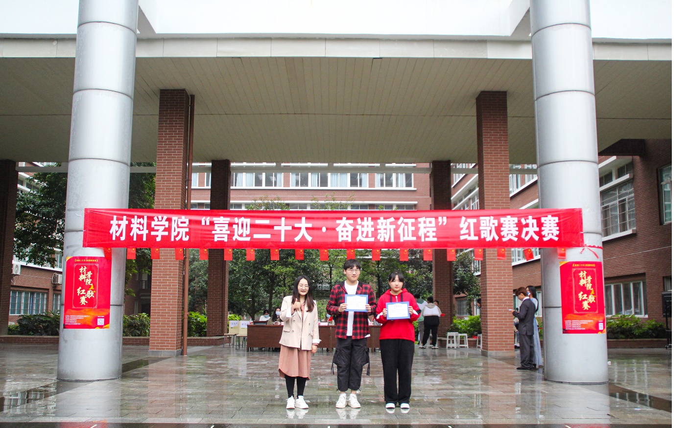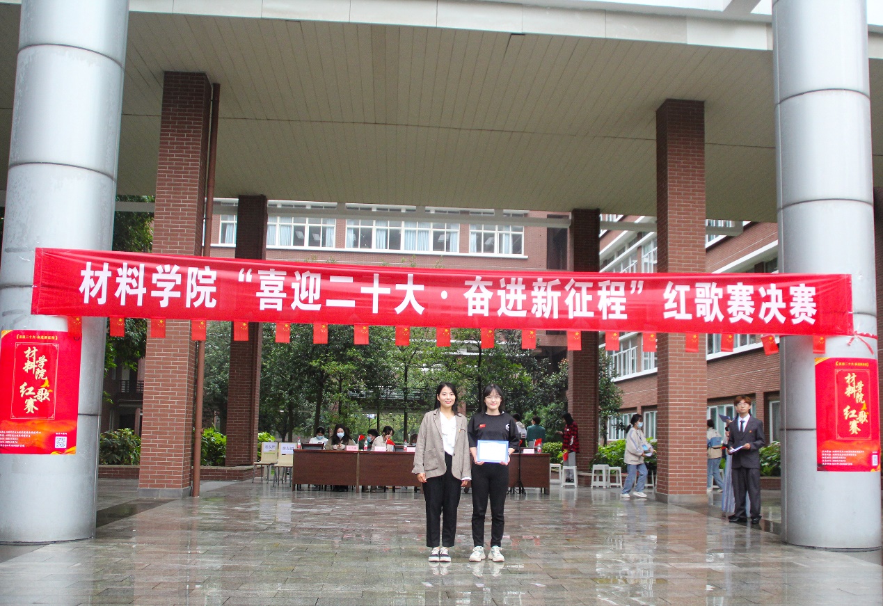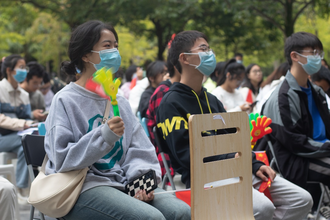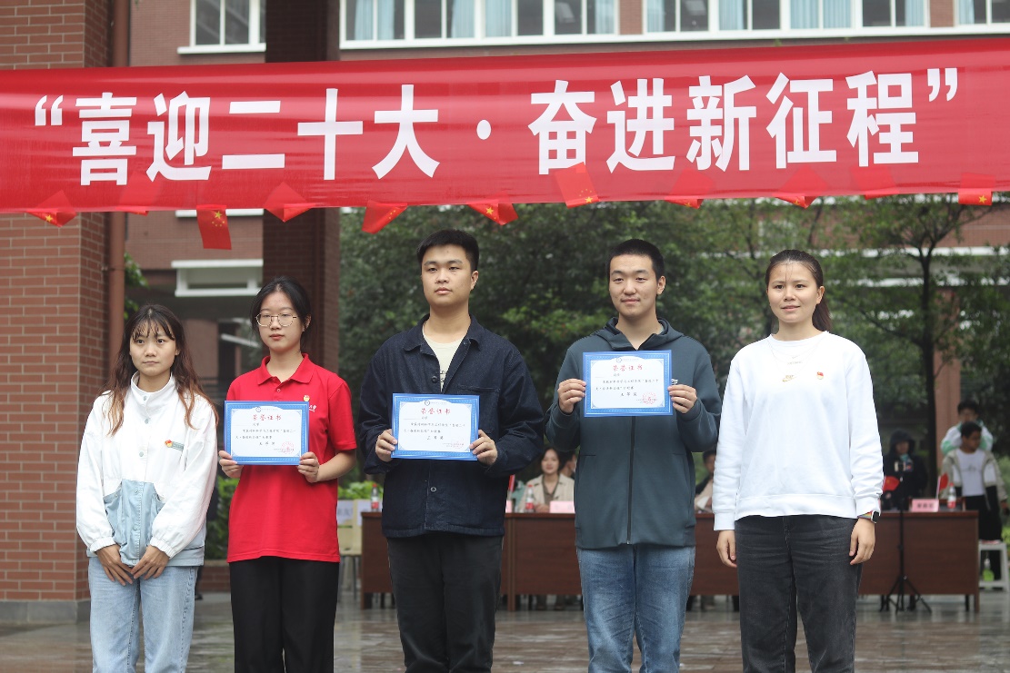 金秋时节,细雨霏霏,天空中突然飘起的雨花并未击退同学们的热情,场地迅速转换,参赛者们仍以或激昂高亢、或字句铿锵、或低沉颂吟的红歌,真情歌颂党的丰功伟绩,抒发对党的炽热情怀,唱出了“喜迎二十大•奋进新征程”的坚定信念与对党丰功伟绩的不朽赞歌。