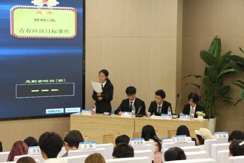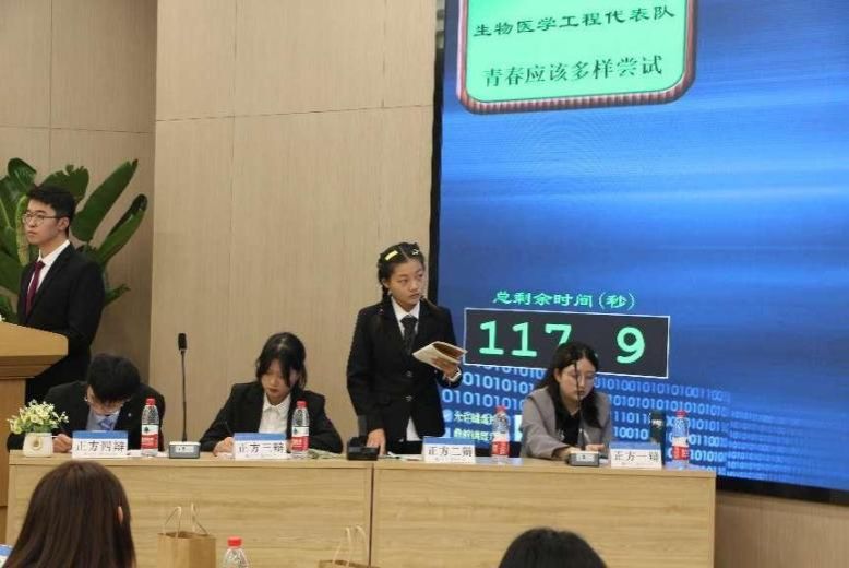本次决赛的辩题是“青春应该多样尝试还是目标聚焦”,正方为生医代表队,认为“青春应该多样尝试”,反方为材料6班代表队,持相反观点。比赛开始,正反方对各自的观点立论陈词;随后进入攻辩环节和自由辩论环节,双方辩手紧扣对方论点中的漏洞,进行了一次又一次的思想碰撞,并将本次决赛推向白热化阶段,台下掌声不断。最后正反双方四辩总结陈词,为本场辩论收尾。