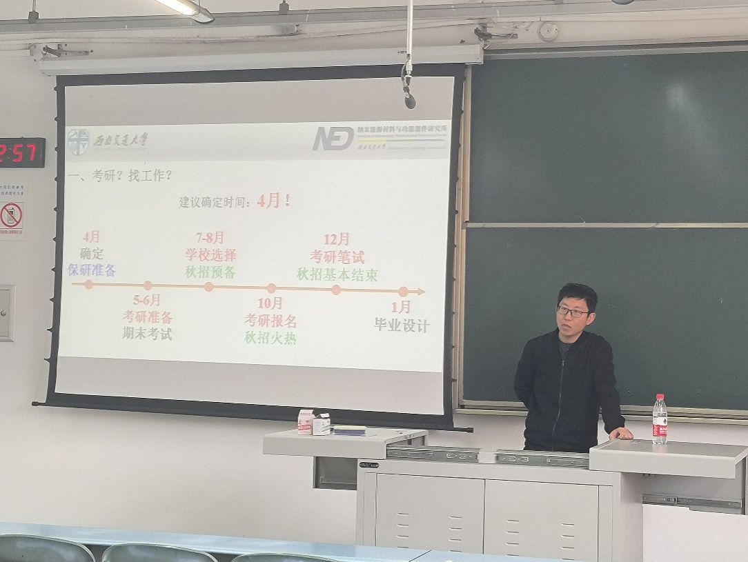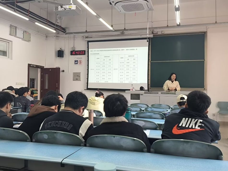 班主任靳龙老师就考研和就业问题针对同学们的意向给予指导,介绍了本校优秀研究团队、导师及研究方向等。他为准备考研的同学们分享复习规划经验,并建议同学们尽早选择志愿学校,提前做好准备工作。最后他回答了同学们关心的问题,鼓励同学们坚定目标、勇往直前。