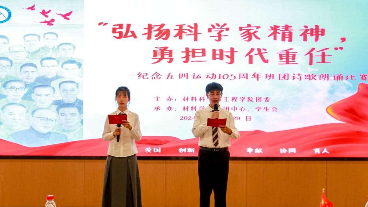 自主编排显材子青春才气,生动演绎热血澎湃颂科学。4月29日晚19:30,“弘扬科学家精神,勇担时代重任”——纪念五四运动105周年班团诗歌朗诵比赛决赛在图书馆一号报告厅拉开帷幕。公司党委副书记熊钰,公司党委员工工作部立德树人教育发展中心指导老师薄琳,公司党委员工工作部扬华e媒体中心指导老师袁文林,马克思主义学院团委书记赵晨应邀出席。参赛班级导师楚珑晟、吴影、张振林,材料学院辅导员代表、各团学组织员工干部及200余名本科同学参加。