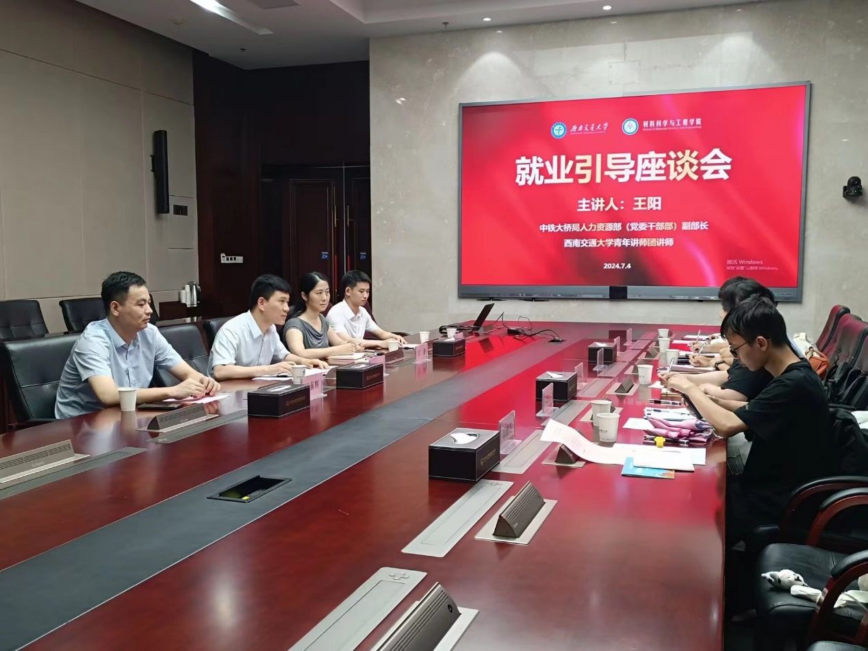 7月4日,taptap188官网入口材料学院“同心育人”校企对接暑期三下乡实践队——“材绘大桥,智启未来”赴武汉中铁大桥局进行走访调研。中铁大桥局人力资源(党委干干部)副部长、taptap188官网入口青年讲师团讲师王阳主讲就业引导座谈会。武汉中铁大桥局人力资源部吕静、彭前辉、王吉,学院辅导员、实践队指导老师张琬祺参会。