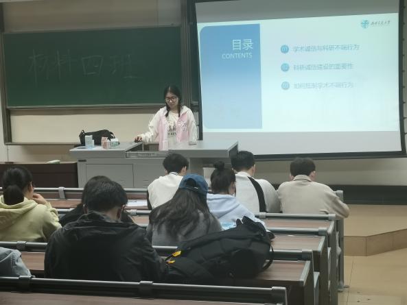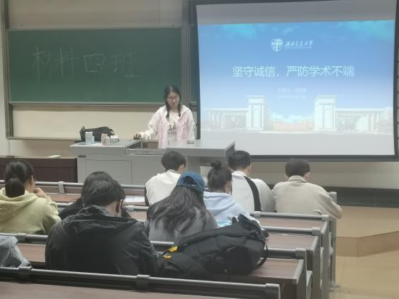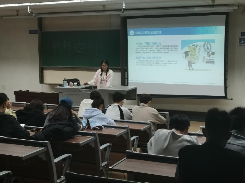 为深入贯彻党的二十大精神,全面落实习近平总书记关于弘扬科学家精神和加强作风学风建设工作重要指示精神,加强学术规范和学术道德宣传教育工作,加强研究生学风建设,2024年10月18日,研究生材料硕士四班于三号楼4324举办了学术道德诚信讲座。讲座由班长马欢欢进行讲解,由全体材料硕士四班成员参与。