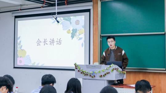 材料青协会长耿琪涛上台致辞。首先他对前来参加材料青协第一次全体大会的朋友们表达了衷心的感谢。其次,他提到材料青协在校、院团委的领导下,具有完善的共青团青年志愿服务体制结构,立足校园、服务社会,以坚持政治引领、服务全体同学、践行志愿精神为目标,推动志愿服务制度化、常态化、长效化发展。从青青小屋“冬日启航”活动到图书馆执勤、从劳动实践基地到青年教师之家打扫,我们坚持开展常规化活动,寻找特色活动,发扬志愿者精神,温暖每一个需要帮助的人。而后,他回顾了在青协工作的这两年中的成长,同时对材料青协的新干事们表示鼓励,希望干事们能在青协拥有一段美好的时光,能够收获友情、爱情,让所有人一起努力,拥抱材料青协更加美好的明天!