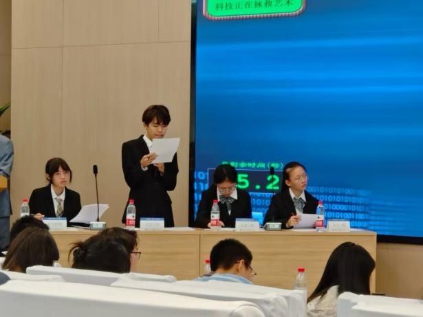 正方材料一班辩论队,他们坚定的认为,科技正在拯救艺术,他们分别从三个角度进行论证:首先是科技为艺术的传播提供了新渠道,其次是科技为艺术创作带来了新途径,最后是科技对艺术品的修复和保存创造了新方法。