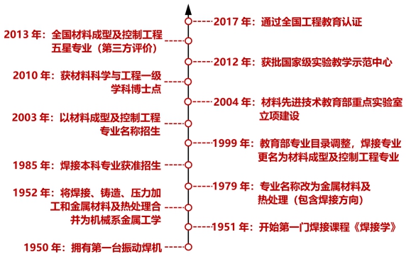 从1950年拥有第一台振动焊机开始,材料成型及控制专业迄今已有七十余年办学历史,专业发展历史沿革如下图所示: