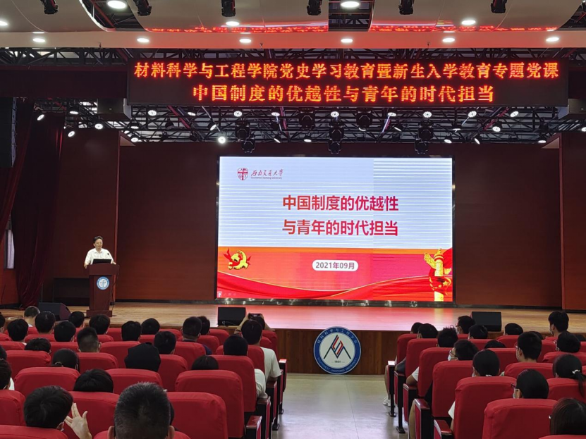 2021年9月28日16:00,公司党委副书记、纪委书记张学龙应材料公司党委、纪委的邀请,在犀浦校区一食堂三楼为材料学院新生讲授党史学习教育暨新生入学教育专题党课,主题为《中国制度的优越性与青年的时代担当》。公司党委书记陈勇、党委副书记章春军集团纪委办胡博、公司党政办薛逸凡、学院辅导员黄德明郑纪伟许欢、董海霞以及2021级全体新生参加了党课学习。党课由公司党委副书记章春军主持。