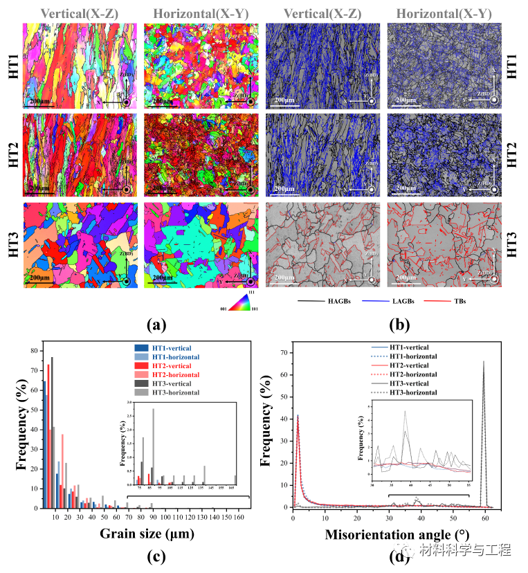 HT1和HT2的垂直和水平试样的晶界取向差大多在2°<θ<15°范围内,属于低角度晶界(LAGBs)。HT3试样的高角度晶界(HAGBs,θ>15°)和孪晶界的比例显著增加(~ 60% <111>60°孪晶界(TBs))。