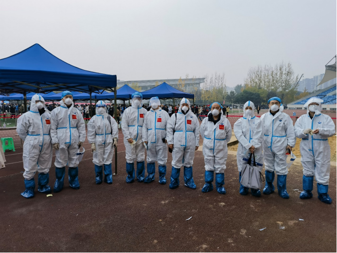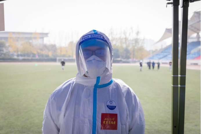 鉴于当前成都市疫情防控形势和新冠病毒变异的新特点,为全面摸排疫情防控风险点、快速切断本土疫情传播链,做到“早发现”“早处置”,切实维护和保障全校师生的生命安全和身体健康,根据成都市新型冠状病毒肺炎疫情防控指挥部通告(2022年第20号)要求,近日学校在犀浦,九里两校区组织开展全员核酸检测。经教职工个人报名,公司党委组织推荐,材料学院14名教职工担任了11月24日校内核酸检测志愿者,在犀浦校区北区田径场协助核酸检测扫码等工作。