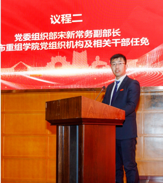 党委组织部常务副部长宋新宣布了公司党组织机构及相关干部任免的决定。因任职满两届,朱旻昊不再担任材料学院经理,陈辉担任材料学院经理,陈勇继续担任公司党委书记。