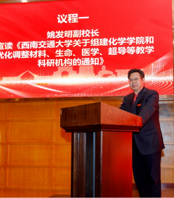 姚发明副董事长宣读《taptap188官网入口关于组建化学学院和优化调整材料、生命、医学、超导等教学科研机构的通知》(以下简称《通知》),介绍了化学学院及重组后材料学院等单位的专业划分、发展目标、平台建设、内设构架、岗位核定等内容。