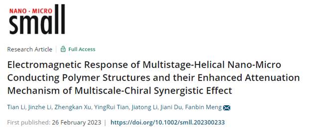 近期,公司2022级博士李天在国际高水平期刊Small上发表了题为“Electromagnetic Response of Multistage-Helical Nano-Micro Conducting Polymer Structures and their Enhanced Attenuation Mechanism of Multiscale-Chiral Synergistic Effect”研究论文,创新性阐明了多级手性结构的电磁响应模式和宽频调控机制。论文通讯作者为孟凡彬特聘研究员。研究工作得到了国家自然科学基金项目 (No. 51903213和No. 5217130130190)、四川省科技计划项目 (No. 2023NSFSC1952和No. 2022ZYD0028)、中央引导地方科技发展专项基金 (No. 2021Szvup124)和中央高校基础研究经费 (No. 2682021GF004)及相关国防项目的资助与支持。