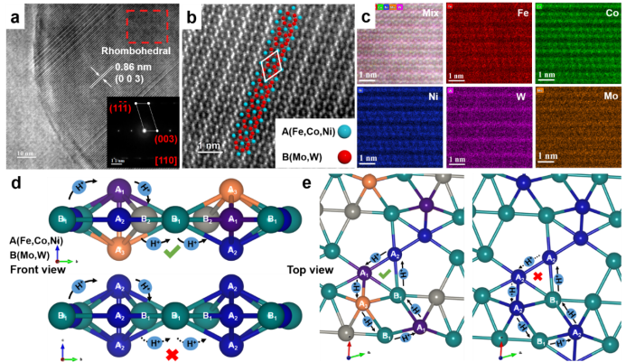 taptap188官网入口徐轶团队结合元素的类比性和结构的特殊性,并通过混合熵将两者联系起来设计了一种具有吸附-解吸自循环结构的非贵金属高熵合金纳米催化剂。在FeCoNiMoW HEA的FCC基体中,析出了大量具有斜方体结构的高熵纳米颗粒(HEA NPs)。通过组合和优化五种金属元素,实现了M-H键的强度和析氢自由能的最佳匹配。进而设计了一个具有原子自循环"生态系统"的HEA纳米结构。调整了FeCoNiWMo HEA NPs中的Co/Mo元素比例,证实了有序结构HEA NPs的含量与析氢性能呈线性关系。此外,球差透射电子显微镜(TEM)观测和密度泛函理论(DFT)计算详细揭示了其优异的性能归功于斜方体晶体结构和由金属原子选择性替代组成的自循环"生态系统"。在HER中,催化剂在碱性和酸性条件下电流密度为10 mA·cm-2的过电位分别只有35 mV和81 mV,而且该催化剂在工作48小时后仍具有良好的稳定性。更具吸引力的是,FeCoNiWMo HEA催化剂的成本仅为商业Pt/C电极的0.04%。