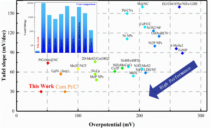电化学裂解水制氢被认为是获得氢气的一种有效方法。然而,这种方法高度依赖于一系列贵金属催化剂,如铂(Pt)。长期以来,人们一直在努力寻找替代催化剂,其中催化剂表面的氢气吸附和解吸因素通常被视为设计准则。尤其是较强的M-H键可以聚集更多的质子,但也将导致较弱的氢气解吸和较慢的活性位点释放;反之,则导致缓慢的氢气进化反应速率。由于成分的限制和固定的化学比例,要通过传统的二元合金实现对氢气吸附自由能的多样化调节具有很大有难度,这使得它们无法满足日益增长的性能需求。随着高熵合金的引入,人们提出了多主金属元素的协同催化作用的机制。在催化反应过程中,元素的协同作用对优化高熵合金起着重要作用。