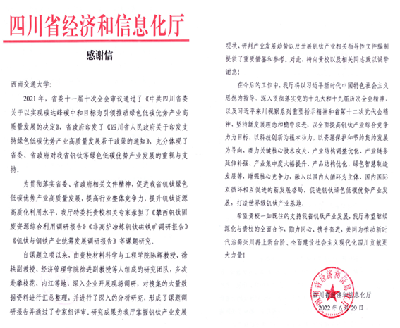近些年,材料学院金属材料系立足攀西钒钛稀土综合利用的国家战略,多次赴攀枝花、西昌和内江等地,深入企业开展现场调研,为国家和省市撰写了《非高炉冶炼钒钛磁铁矿调研报告》、《钒钛与钢铁产业统筹发展调研报告》、《攀西固废资源综合利用调研报告》。协助编写中国工程院《四川攀西优势资源综合利用及产业发展战略咨询报告》。参与《四川省先进材料产业“十四五”高质量发展路径研究报告》、《四川省推进钢铁行业“双碳”战略示范研究》等重大课题,为四川发展钒钛稀土新材料及先进制造提供政策建议。建议得到省委省政府、国家发改委批示,获四川省经济和信息化厅发文感谢,策划中国工程院战略研究与咨询(地方院重大)项目获批。