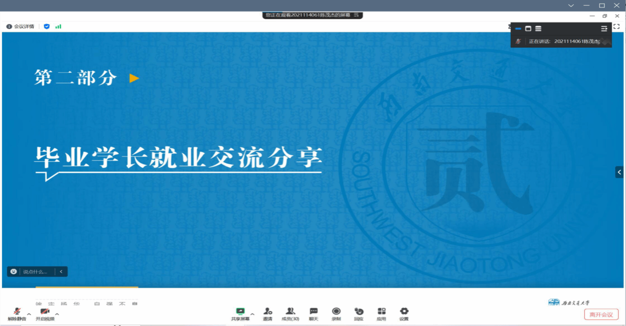 成型2021-03班班导师刘拥军、李达参加就业班会,引导同学们畅所欲言、做好未来规划,并邀请已就业的优秀学长刘赞和罗玉林分享大学阶段能力提升的重要性和如何提升面试成功技巧等。