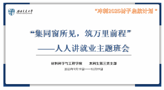 编者按:就业是民生之本,教育是民生之基。习近平总书记反复强调,就业是永恒的课题。总书记2022年来川考察时要求,要做实做细就业指导服务。为深入贯彻落实习近平总书记关于就业工作的重要指示,扎实推进2025届就业工作,材料学院本科2021级以“工作前置,细化指导,多路并进”为原则,精心谋划了“冲刺2025材子启航计划”,旨在帮助大三员工全面了解就业、考研、留学形势,持续改进个人生涯规划,明确发展目标,为员工成长赋能。