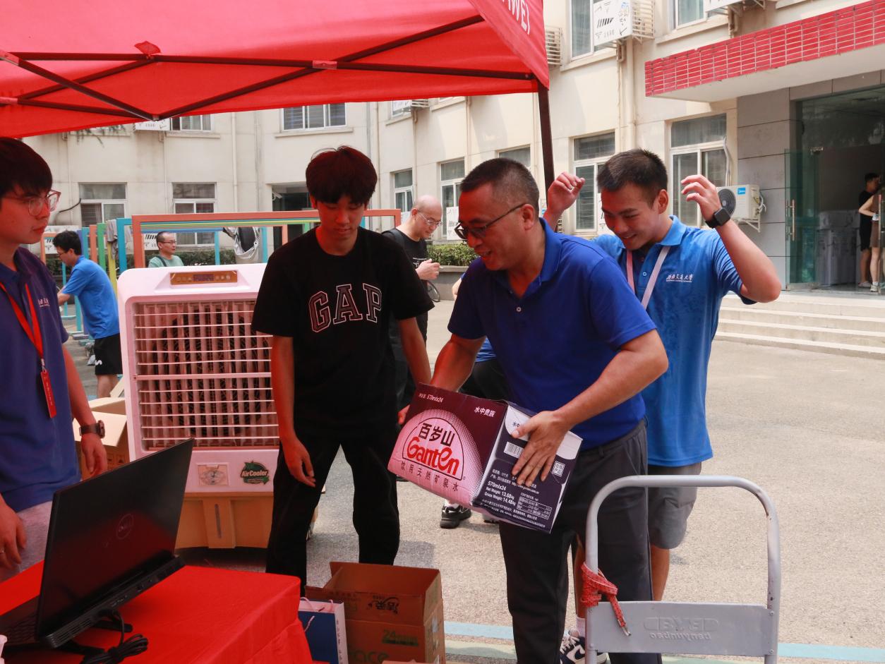 王良辉老师代表学院工会为迎新现场送去消暑佳品,并在现场关心了解新生报到情况,鼓励大家保持良好的精神状态做好迎新工作,展示材料学院风彩。