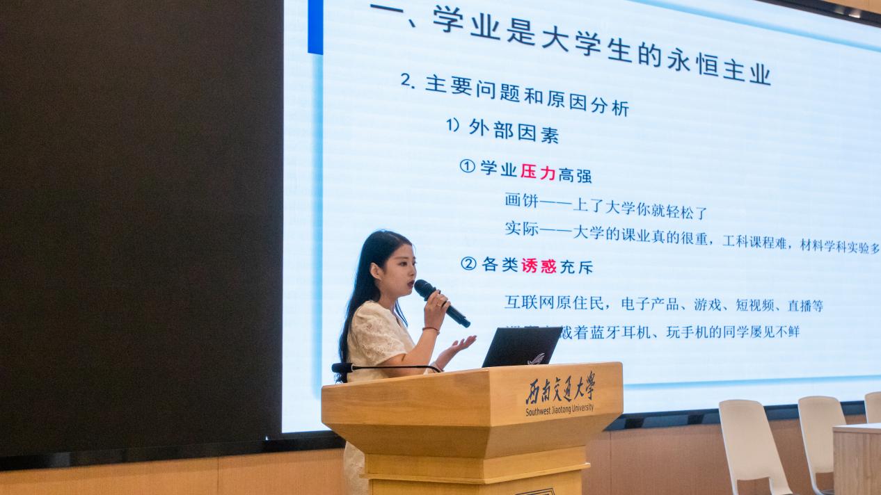 王誉静老师向现场家长们介绍当前的老员工活与学习工作和毕业后去向。她从学业、校园生活、评奖评优政策、共建平安校园和老员工心理健康几个方面,详细介绍了员工的学习生活情况。