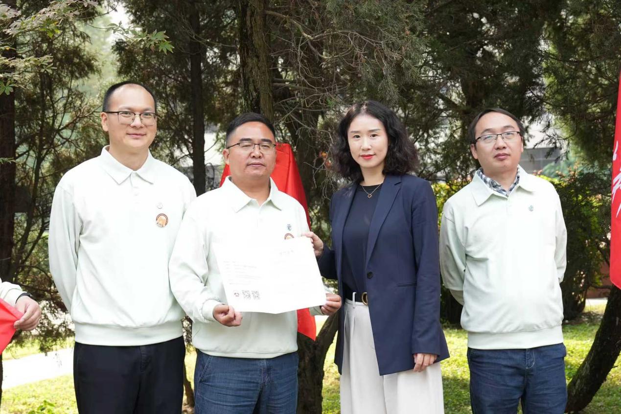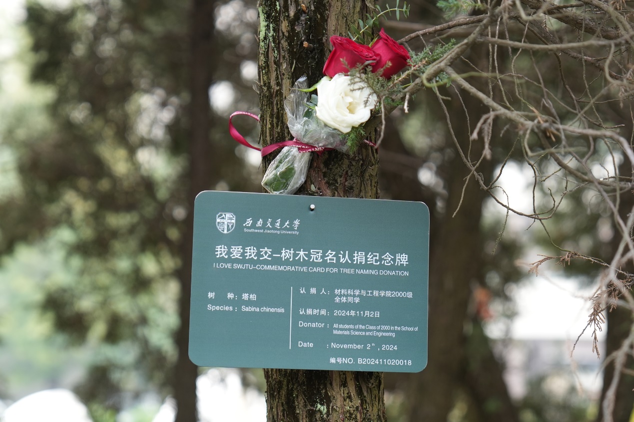 11:30,员工们来到茅以升图书馆前,举行“我爱我交——树木冠名认捐”活动。员工办副主任彭燕出席活动,欢迎材料2000级员工返校,感谢参加认捐活动。随后彭燕副主任和三个班的代表共同揭牌,并送上认捐证书。