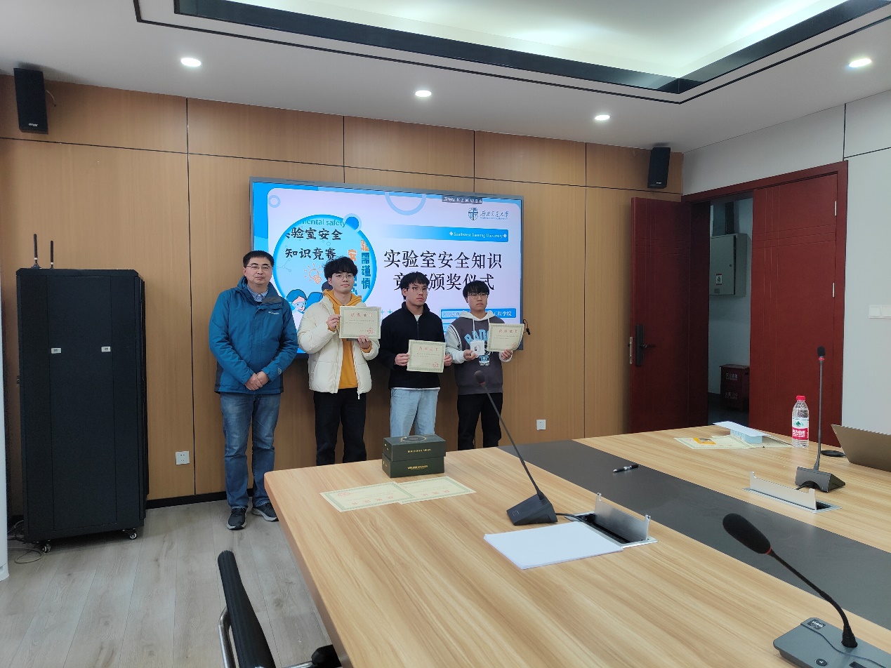 随后,进入颁奖环节。材料学院蒋小松副经理、金材系主任徐轶教授和曾迎老师为获奖同学颁奖。蒋小松对获奖同学表示祝贺,并鼓励大家在今后的学习和实验中,继续严格遵守安全规范,确保实验安全。