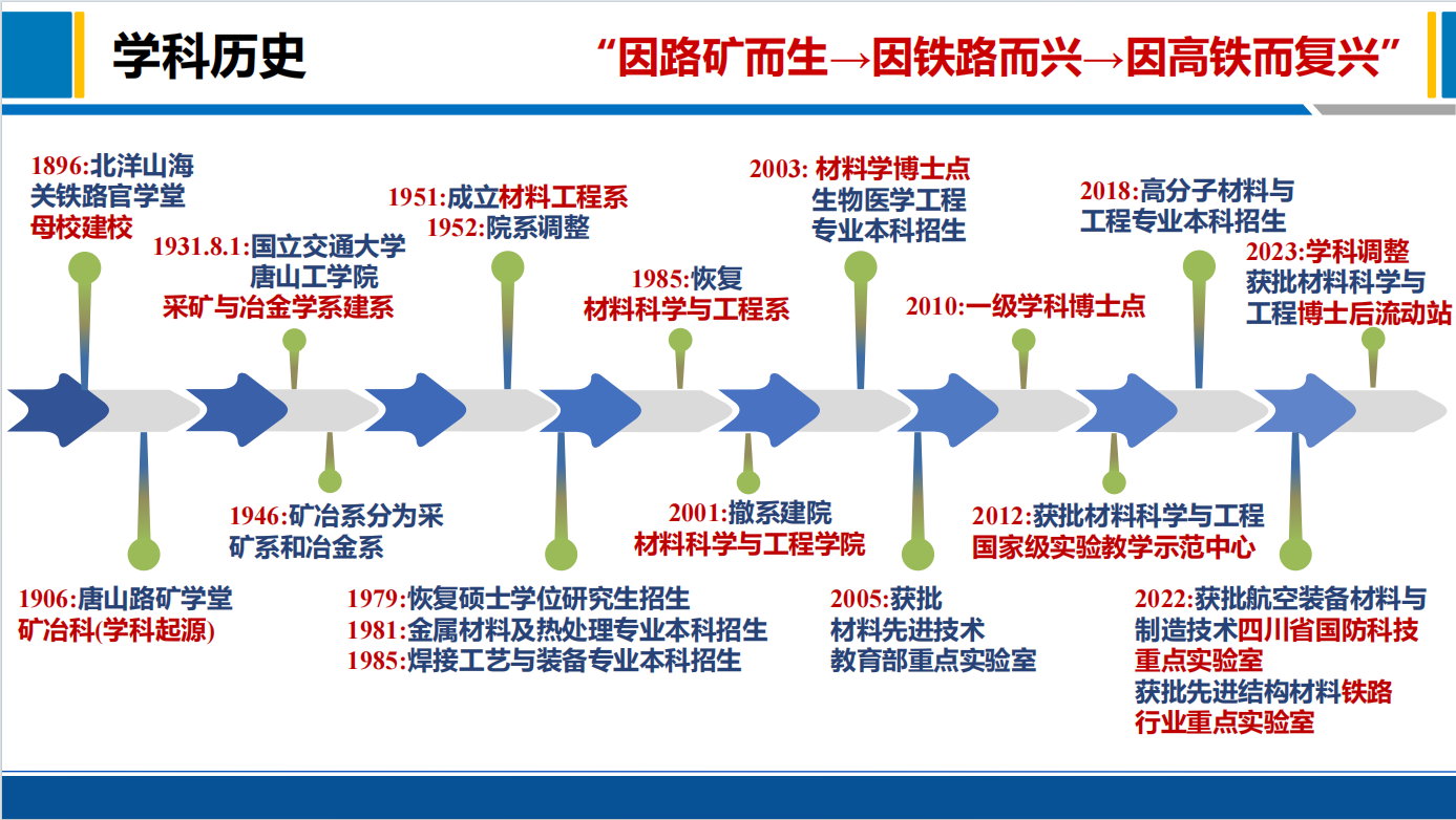 taptap188官网入口材料学科的历史可追溯至1905年,其前身为中国最早的矿冶工程教育体系之一,培养了包括3位“两弹一星”功勋奖章获得者和16位院士在内的顶尖人才。材料学科聚焦于国家“交通强国”重大战略,围绕高铁、磁浮、川藏铁路等国家重大工程需求,构建了覆盖材料设计、制备、服役评价的全链条研究体系,形成了从轨道交通材料设计理论与方法、先进成型制备、绿色智能加工、全生命周期服役安全可靠性评价的理论、技术研究体系,全面支撑了国家轨道交通材料自主自强,引领了未来轨道交通发展方向。