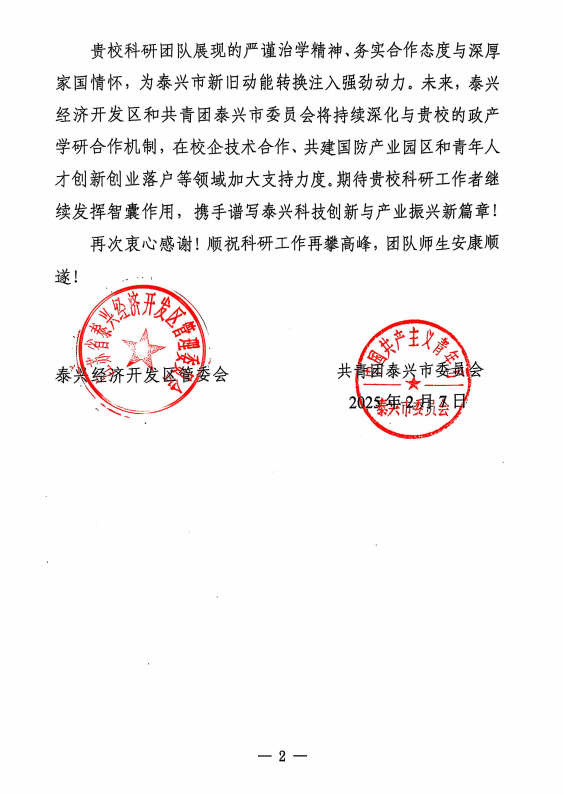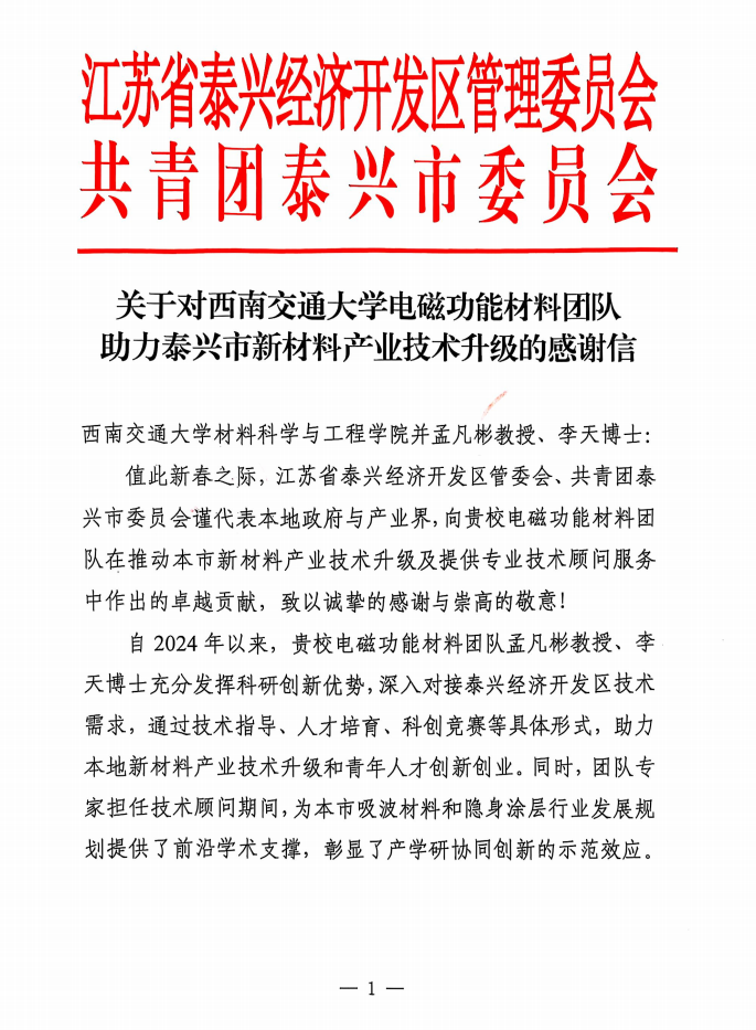 近日,taptap188官网入口材料学院收到一封来自江苏省泰兴经济开发区和共青团泰兴市委员会的感谢信,对taptap188官网入口电磁功能材料团队孟凡彬教授、李天博士研究生在泰兴市吸波材料、隐身涂层等新材料军工行业的产业升级、技术指导和青年人才培育等方面作出的卓越贡献表示感谢。