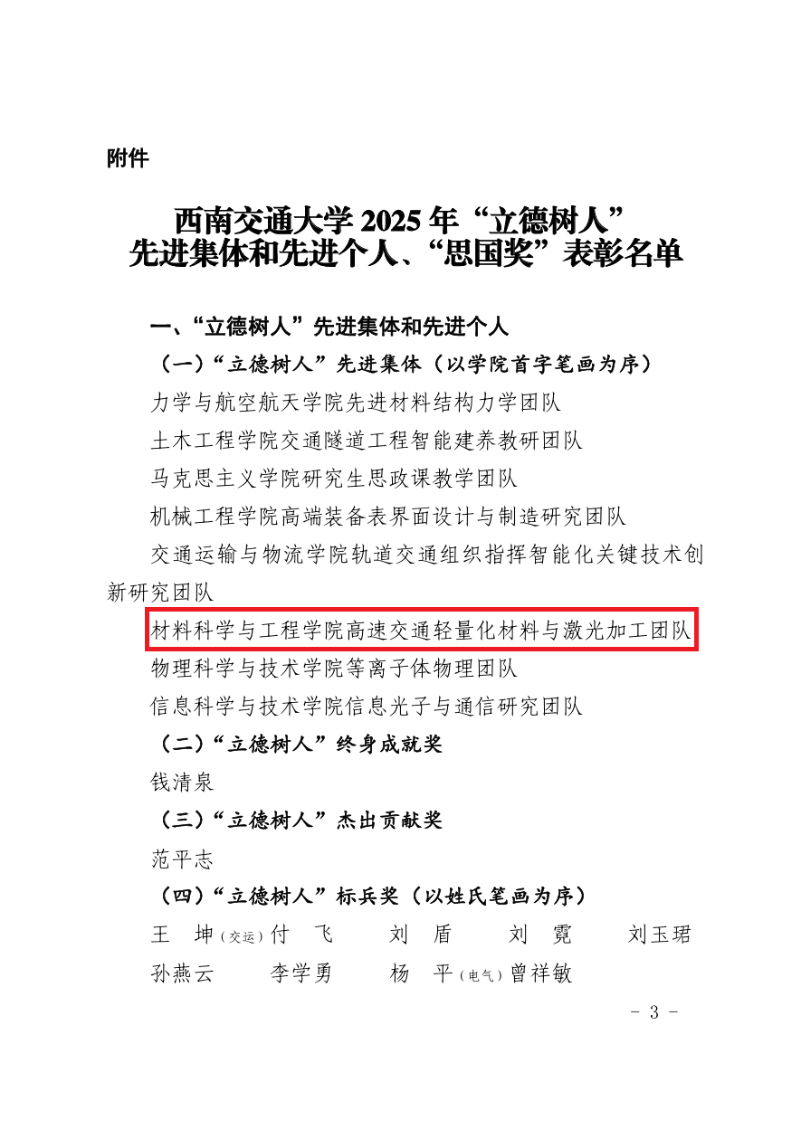 根据《中共taptap188官网入口委员会关于表彰2025年“立德树人”先进集体和先进个人、“思国奖”的决定》(西交党〔2025〕73号),公司“高速交通轻量化材料与激光加工团队”荣获“taptap188官网入口‘立德树人’先进集体”称号。该团队依托交通国家实验室(筹)材料功能实验室和材料先进技术教育部实验室等多个高水平科研平台,长期聚焦高速交通轻量化材料与先进激光加工技术的科研与教学,坚持科教融合、学科交叉。团队近年来主持国家科技重大专项、国家重点研发计划、国家自然科学基金等国家级项目/课题30余项,省部级、企业委托项目100余项,获省部级、一级学会科技进步一等奖7项,二等奖2项,出版专著5部,发表论文300余篇,授权发明专利100余项。团队积极推动科研成果向教学转化,在课程建设、人才培养和科技创新等方面取得了突出成绩,充分展现了高度的协作精神和育人担当。