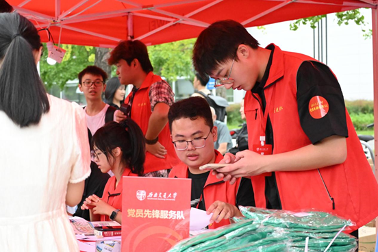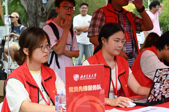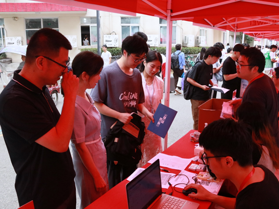 公司党委书记沈哲,副经理刘艳、蒋小松在现场了解询问新生迎新工作开展情况,问候关怀坚守一线的工作人员和员工志愿者,并对公司教师团队表示关心与鼓励。