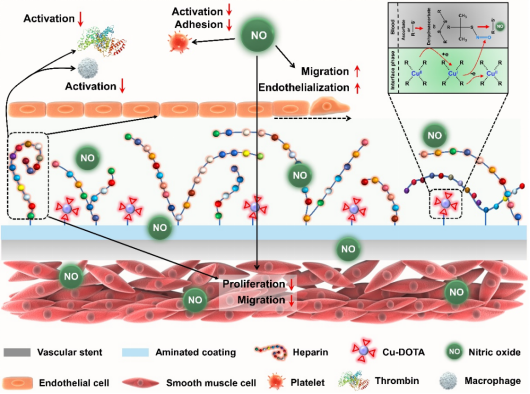 图1. 通过共价固定NO产生物质Cu-DOTA配位复合物和生物活性分子肝素,获得了持久的心血管支架表面生物工程仿内皮涂层